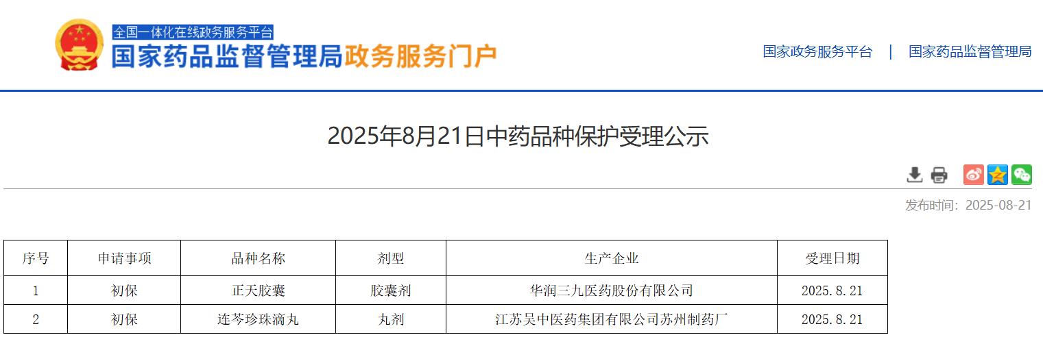 2025年8月21日中藥品種保護(hù)受理公示