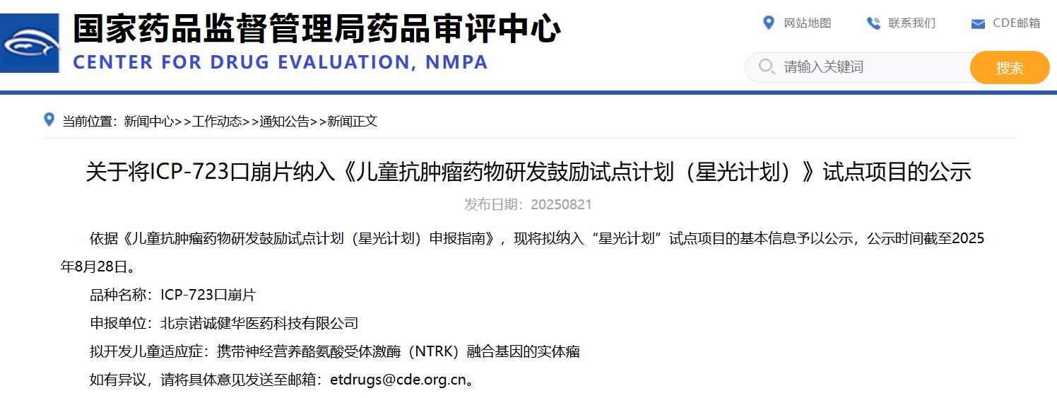 關(guān)于將ICP-723口崩片納入《兒童抗腫瘤藥物研發(fā)鼓勵(lì)試點(diǎn)計(jì)劃(星光計(jì)劃)》試點(diǎn)項(xiàng)目的公示