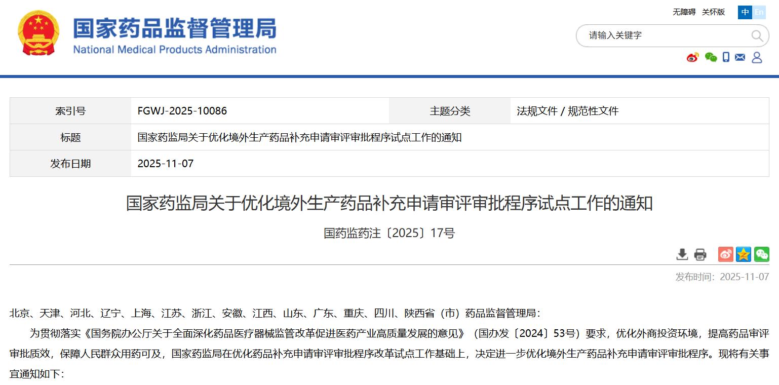 政策法規(guī) || 關(guān)于優(yōu)化境外生產(chǎn)藥品補充申請審評審批程序試點工作的通知(附法規(guī)概覽11.3-11.7)