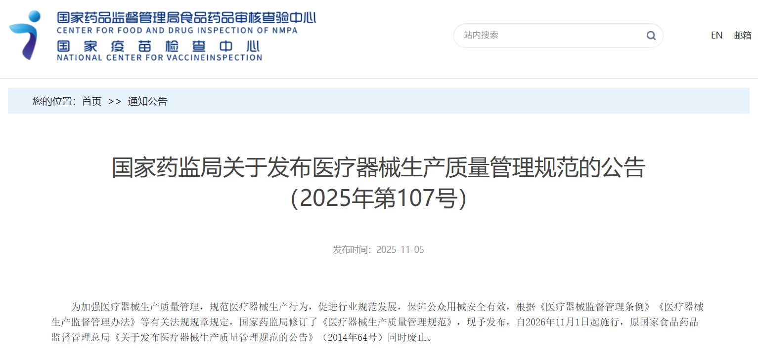 國家藥監(jiān)局關(guān)于發(fā)布醫(yī)療器械生產(chǎn)質(zhì)量管理規(guī)范的公告(2025年第107號)