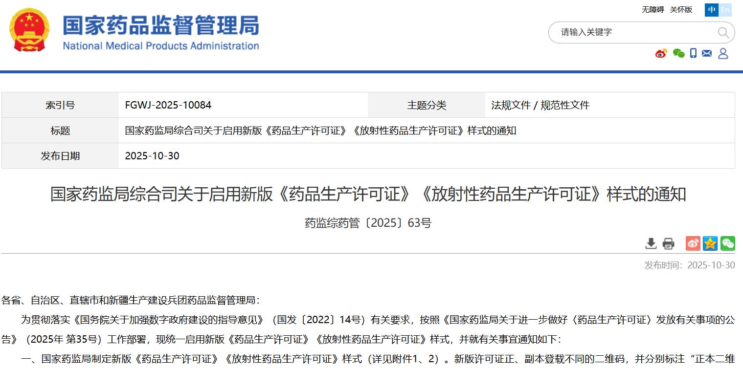 國家藥監(jiān)局綜合司關(guān)于啟用新版《藥品生產(chǎn)許可證》《放射性藥品生產(chǎn)許可證》樣式的通知