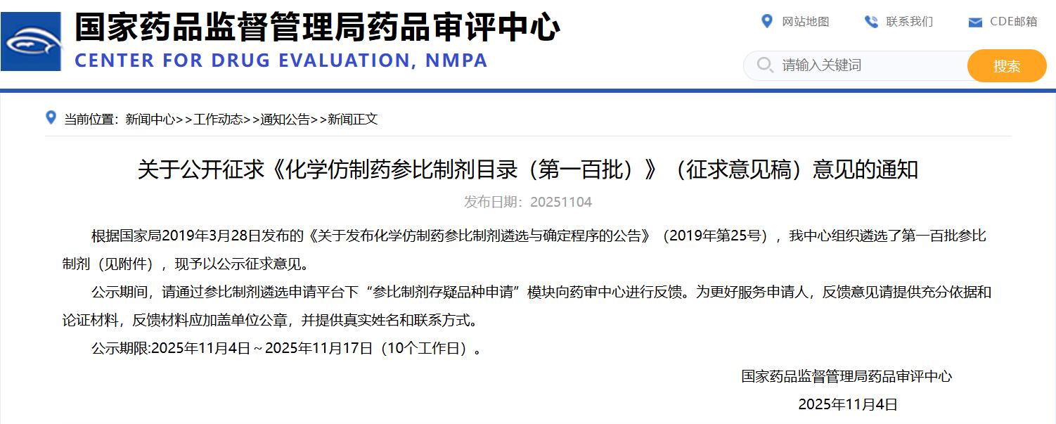 關(guān)于公開征求《化學仿制藥參比制劑目錄(第一百批)》(征求意見稿)意見的通知