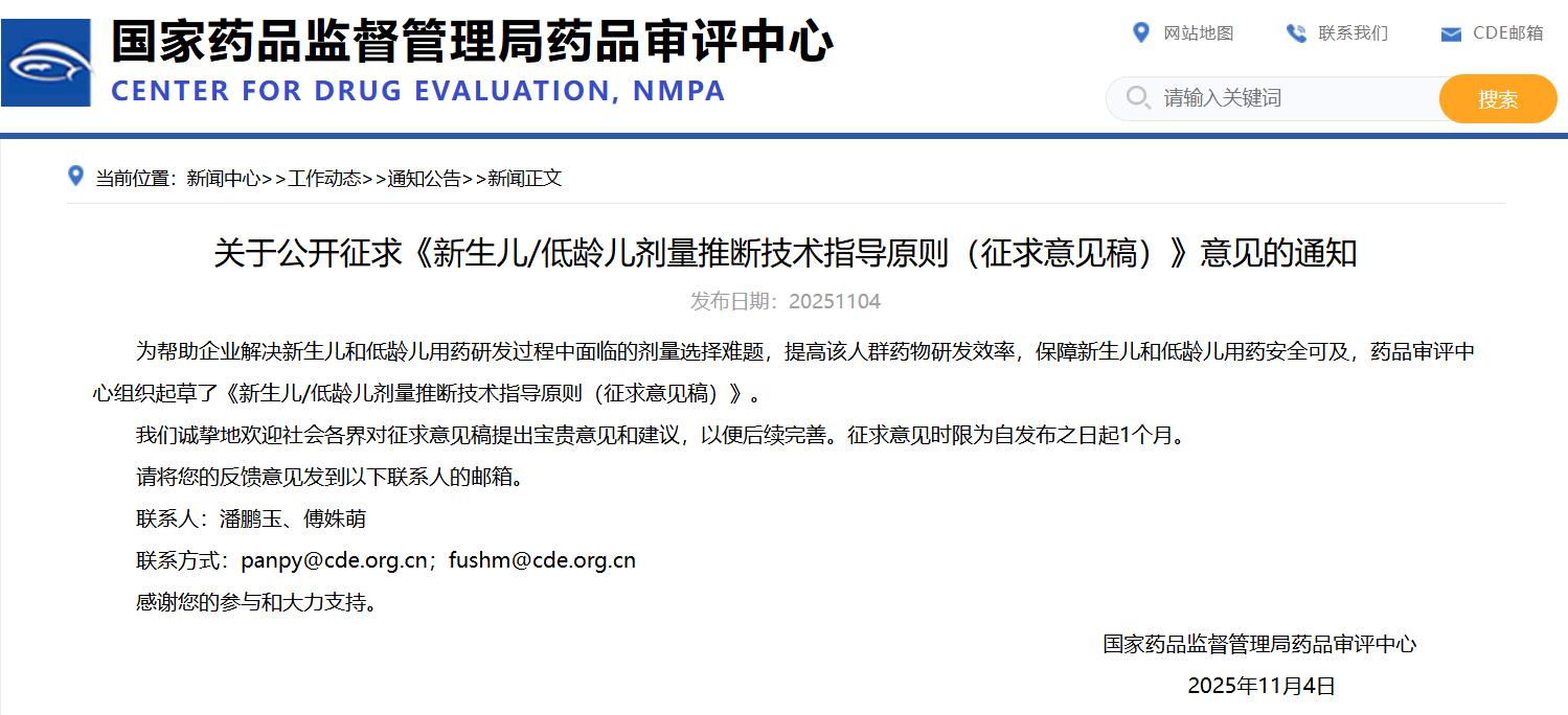 關(guān)于公開征求《新生兒/低齡兒劑量推斷技術(shù)指導原則(征求意見稿)》意見的通知
