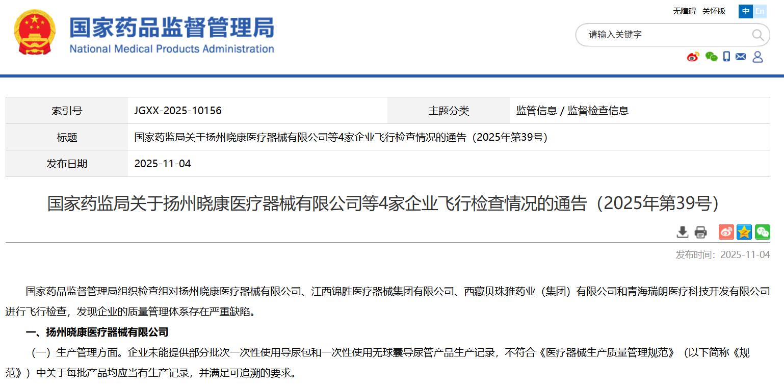 國家藥監(jiān)局關(guān)于揚州曉康醫(yī)療器械有限公司等4家企業(yè)飛行檢查情況的通告(2025年第39號)