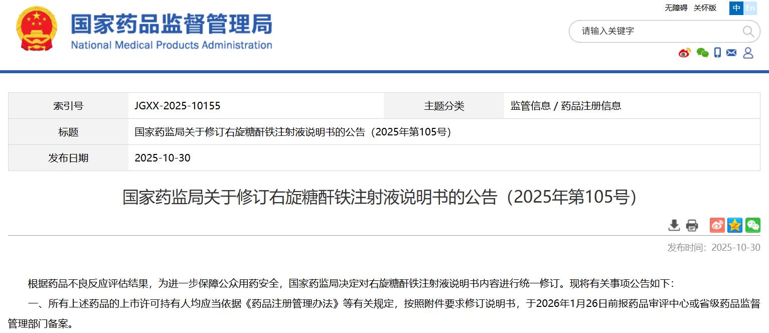 國家藥監(jiān)局關(guān)于修訂右旋糖酐鐵注射液說明書的公告(2025年第105號)