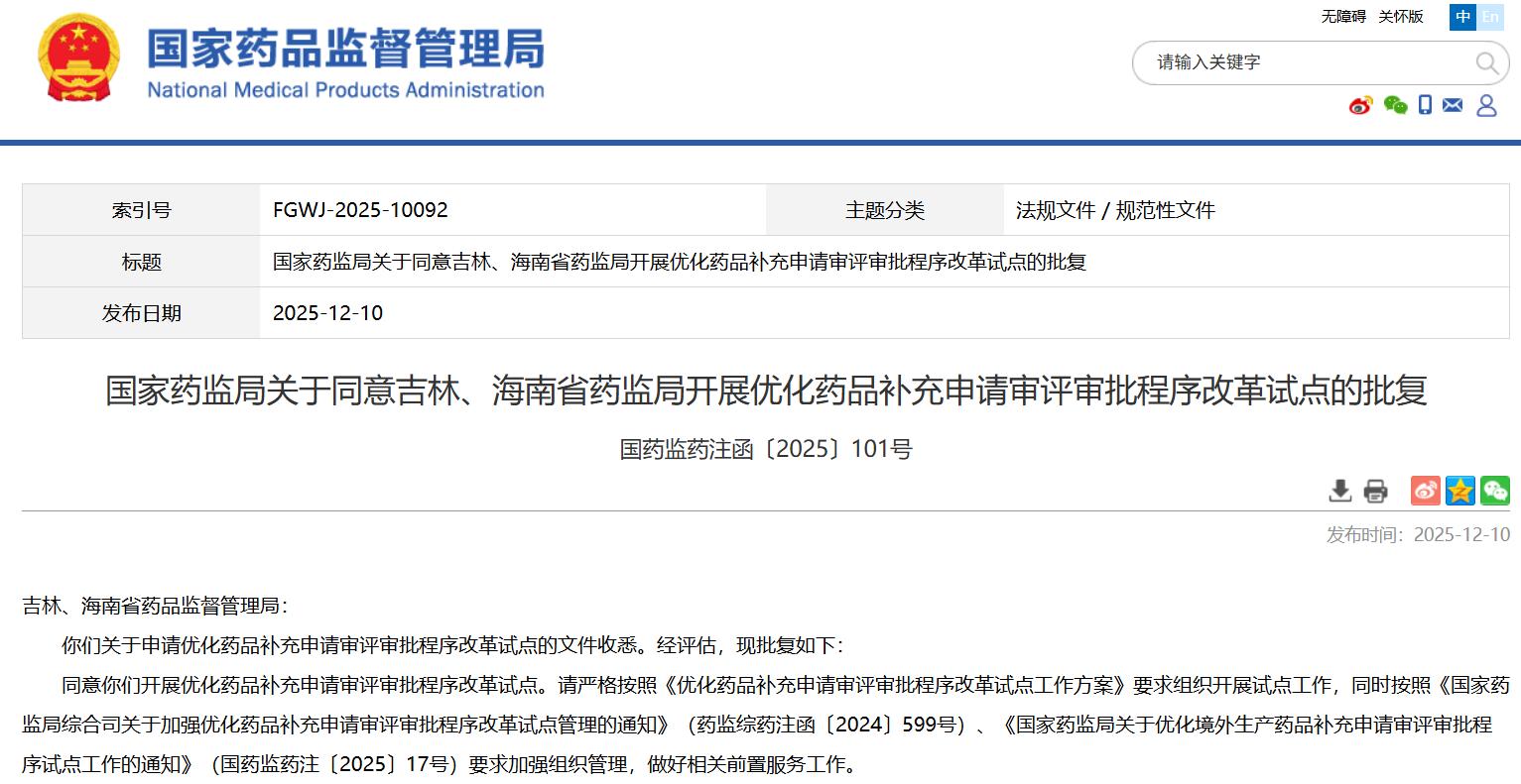 政策法規(guī) || 關于同意吉林、海南省藥監(jiān)局開展優(yōu)化藥品補充申請審評審批程序改革試點的批復《(附法規(guī)概覽12.8-12.12)