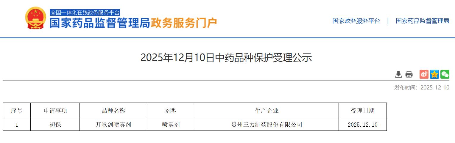 2025年12月10日中藥品種保護受理公示