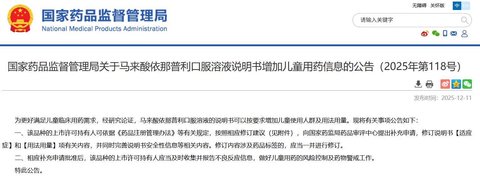 國家藥品監(jiān)督管理局關于馬來酸依那普利口服溶液說明書增加兒童用藥信息的公告(2025年第118號)