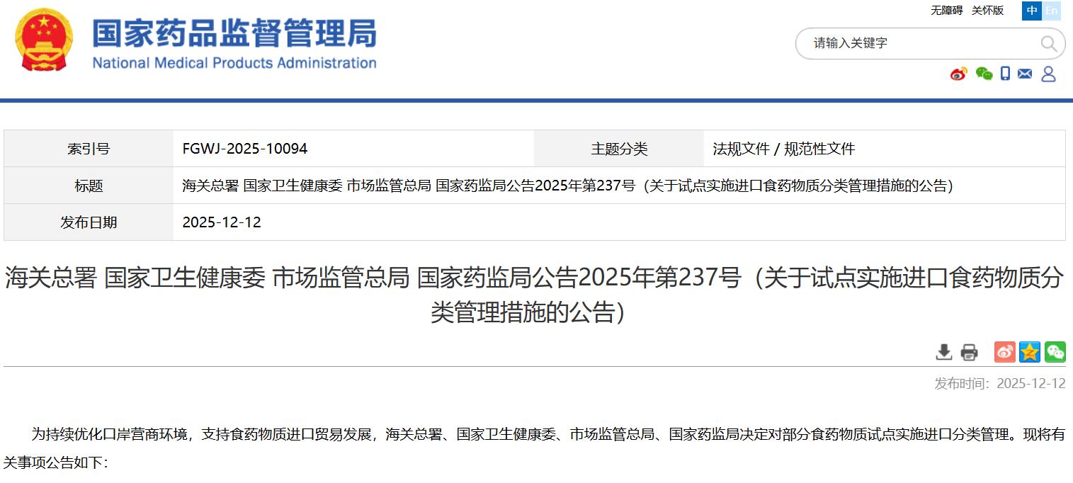 海關總署 國家衛(wèi)生健康委 市場監(jiān)管總局 國家藥監(jiān)局公告2025年第237號(關于試點實施進口食藥物質分類管理措施的公告)