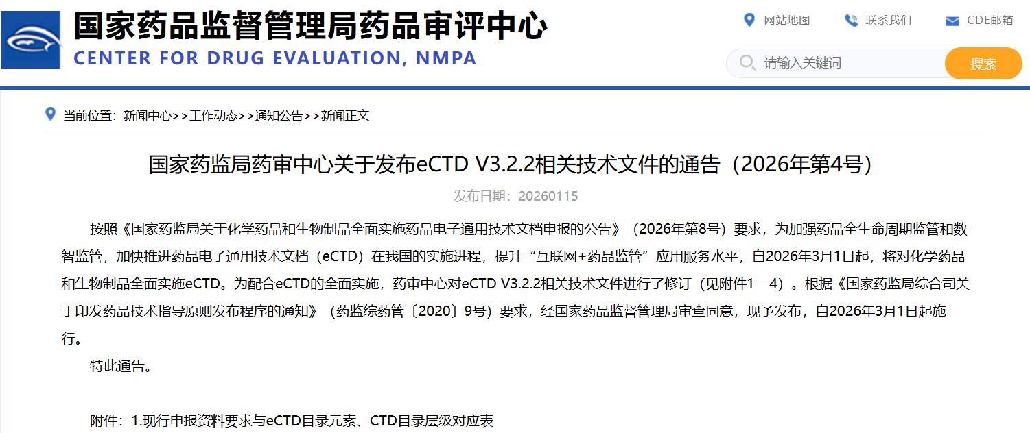 國家藥監(jiān)局藥審中心關(guān)于發(fā)布eCTD V3.2.2相關(guān)技術(shù)文件的通告(2026年第4號)