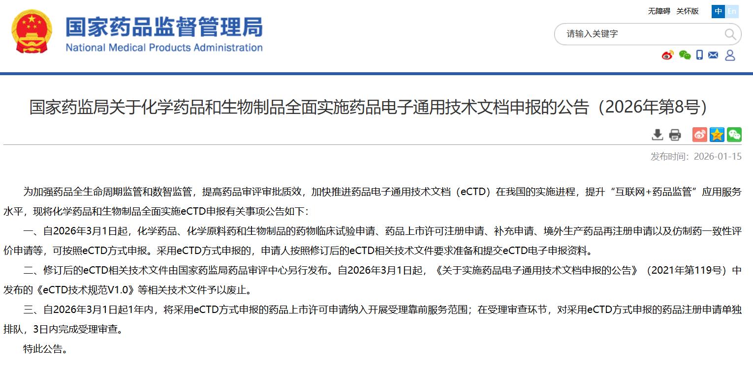 國家藥監(jiān)局關(guān)于化學(xué)藥品和生物制品全面實(shí)施藥品電子通用技術(shù)文檔申報的公告(2026年第8號)