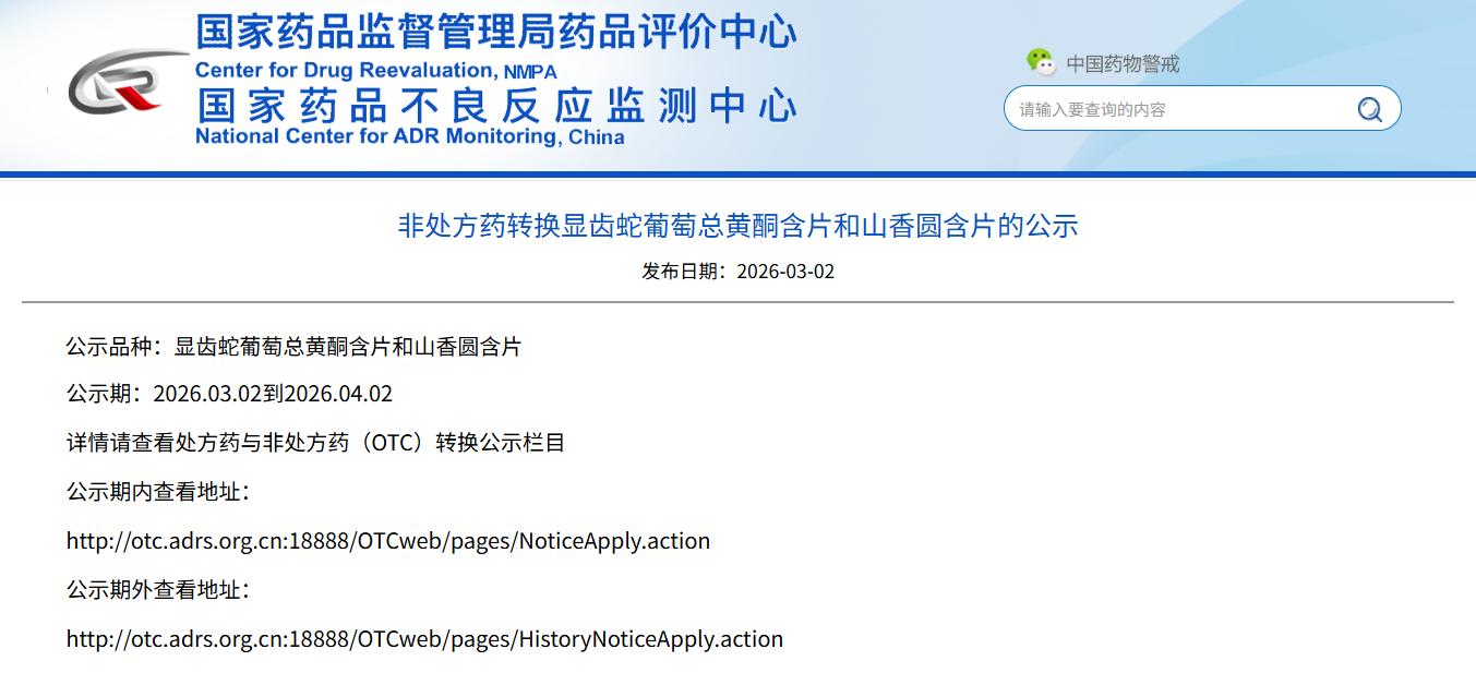 非處方藥轉(zhuǎn)換顯齒蛇葡萄總黃酮含片和山香圓含片的公示